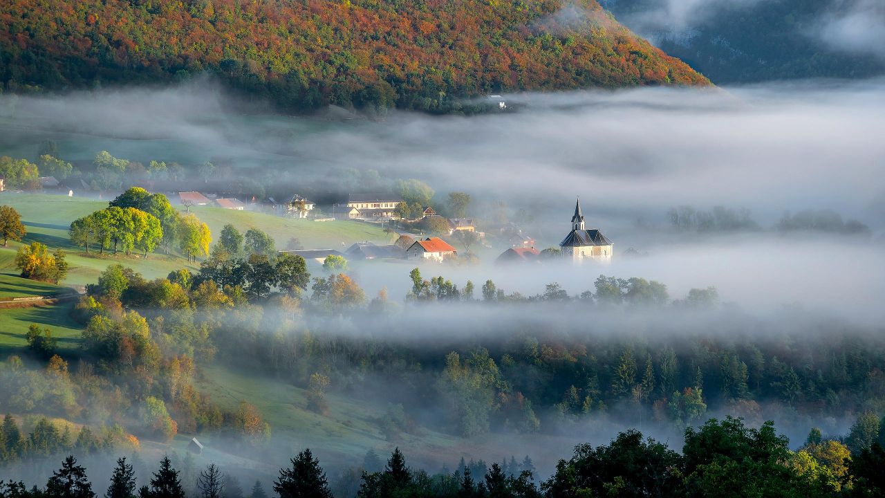 Le cirque des montagnes enveloppe la vallée comme pour la protéger. Le soleil prometteur boit le reste de la nuit. Lovés dans leur berceau, les villages s‘éveillent. Les eaux cristallines du Chéran serpentent au creux de somptueuses gorges. Le ciel pose sur les sommets sa palette. aux teintes improbables… Qu’elle est belle l’âme de ce petit pays !